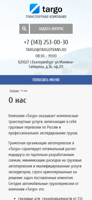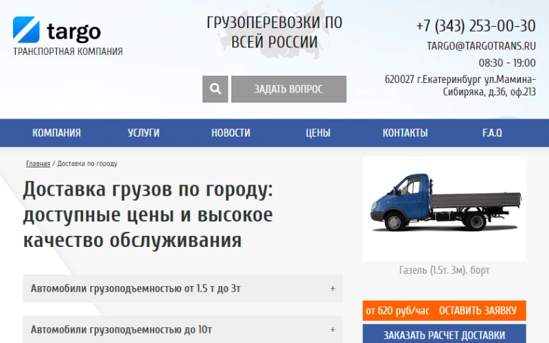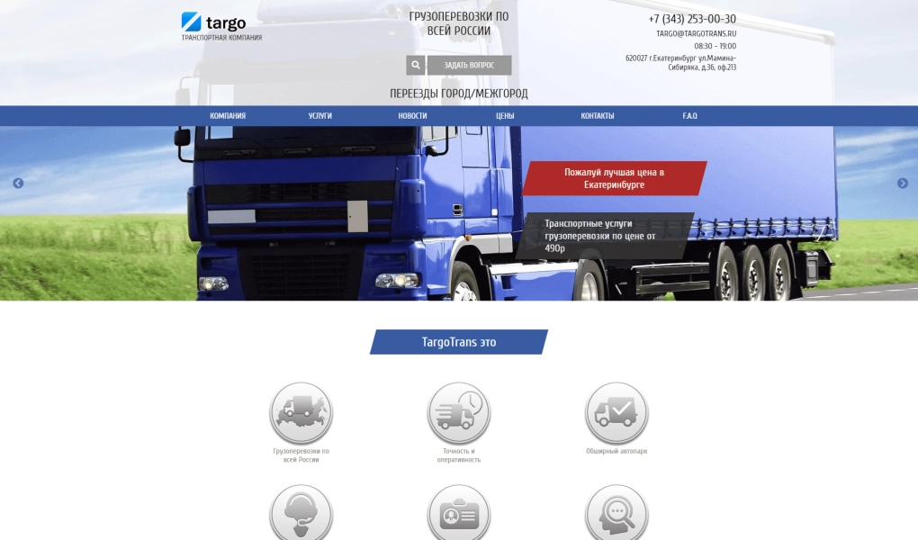Сайт услуг для транспортной компании "Targotrans" в г. Екатеринбурге. Проект включал в себя радработку дизайна, верстку, интеграцию в CMF систему и бэкенд разработку необходимого функционала.